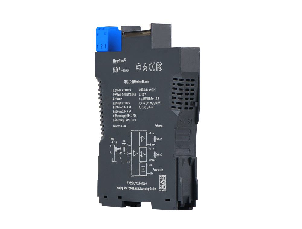 Temperature input isolated barrier, it converts the thermocouple/thermal resistance signals from a hazardous area into 4~20mA signals to a safe area by isolation. It has external cold junction compensation terminals. It needs a backplane power supply. The input, output, and power supply are galvanically isolated from each other. The self-test function is also available on this device. Calibrate the apparatus or modify parameters by using a handheld programmer.