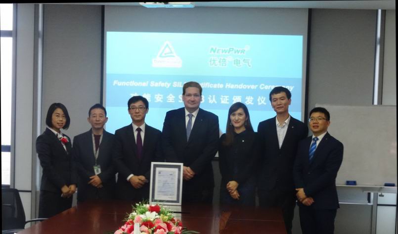 期間舉行了頒證儀式,陶思騰(Thorsten Keiter)先生代表德國(guó)萊茵TUV,向優(yōu)倍電氣頒發(fā)了功能安全(SIL)認(rèn)證證書(shū)。